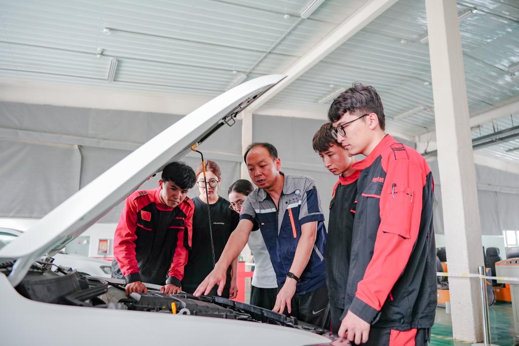 2025年6月27日,在新疆和田技師學院,北京援疆教師李寶(右三)和當地教師一同指導學生維修汽車。新華社記者 徐宏巖 攝