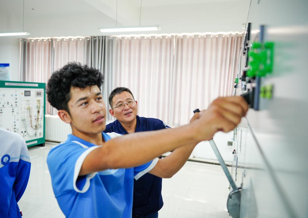 2025年6月27日,在新疆和田技師學院,北京援疆教師李東軍(右)指導學生操作高壓變配電設備。新華社記者 徐宏巖 攝
