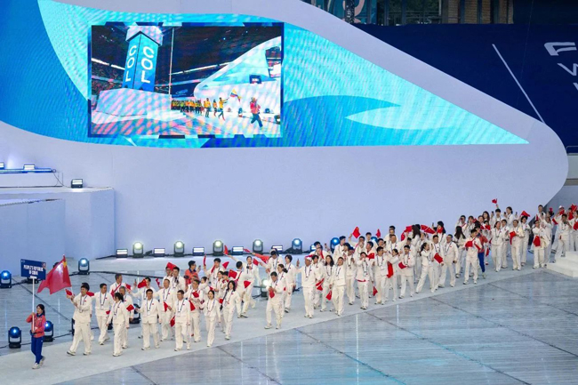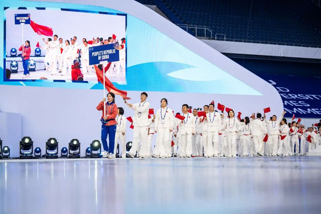 開幕式上,迎來首次大運會之旅的三人籃球運動員劉貝和羽毛球運動員崔赫宸,高舉五星紅旗,走在隊伍前列,光榮、驕傲,成為他們共同的感受。一起來看——