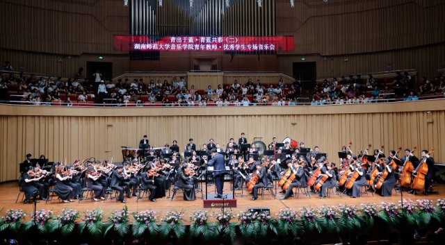 本場音樂會主題中,“青”代表在教師指引下嶄露頭角的優秀學子,他們在課堂汲取知識養分,在實踐中錘煉專業技藝;“藍”象征深耕教壇、潛心育人的教師群體,他們以扎實的專業積淀為學子引路,以滿腔育人熱忱為成長護航。音樂會在瀟湘愛樂交響樂團充滿濃郁湖南味道的管弦樂《花鼓抒懷》中拉開帷幕。其中,廖勇創作的電影音樂組曲《影·響》展現了中西影視音樂創作的碰撞融合。著名小提琴演奏家、學院教授柴亮執弓演繹學院名譽院長趙季平的《第一小提琴協奏曲》,以細膩琴音詮釋大師作品的深厚內涵。青年教師錢樹林深情演繹《美麗時光》,充滿新疆音樂風格的表演讓人耳目一新。青年教師夏攀與博士生導師陳果教授合作的二胡協奏曲《紅梅隨想曲》,讓民族樂器的悠揚與大提琴的渾厚相得益彰。青年教師瞿鈺潔、謝韻蕾帶來的《花之二重唱》,盡顯西方歌劇的優雅浪漫。壓軸曲目《長大后我就成了你》由虢建武、于洋、譚聞達、謝志懷等老中青三代教師與車心怡、何薇羽等學生共同演繹,讓全場情感共鳴達到頂點。