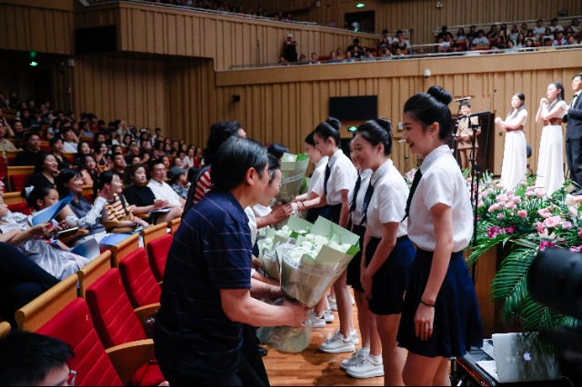 伴隨著天籟合唱團《感恩的心》的輕聲合唱,一場別致的致敬教師儀式溫情上演。作為特邀嘉賓出席的教師代表一一亮相,他們包括湖南省優秀教師、湖南省最美教師、湖南省基礎教育名師名校長工作室負責人、湖南師大退休教師和師德標兵等。伴隨著動人的歌聲,青年學子向教師代表們獻上鮮花,全場觀眾也齊聲向老師們道一聲“老師好”,熱烈的掌聲在音樂廳內久久回蕩,向長期扎根三尺講臺、默默奉獻的老師們致以最誠摯的祝福。