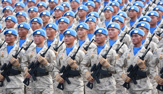 維和部隊方隊官兵頭戴藍色貝雷帽、脖系藍色絲巾,目光如炬、步履堅定走過天安門廣場。