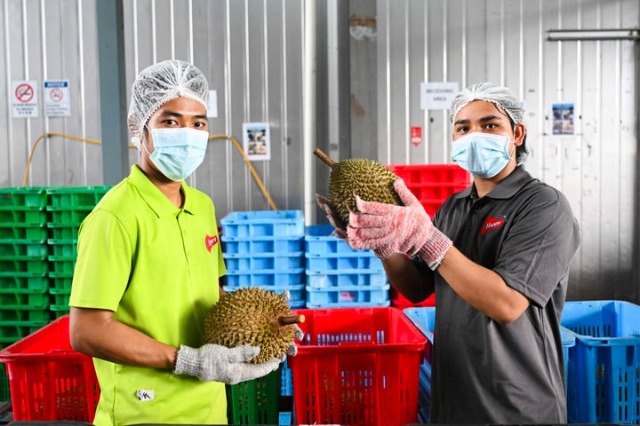 工作人員在馬來西亞雪蘭莪州的一家榴蓮加工廠檢查榴蓮(2025年10月16日攝)。馬來西亞的榴蓮從果園采摘到送到中國消費者手中,全程最快僅需36小時。新華社記者 程一恒 攝