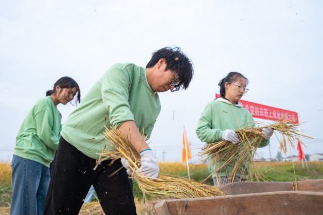54名青年學(xué)子組成9支隊(duì)伍,在金色的稻田里展開了一場激烈的水稻收割比拼。比賽分為“收割”和“脫粒”兩個(gè)環(huán)節(jié),既考驗(yàn)隊(duì)員們使用傳統(tǒng)農(nóng)具的熟練程度和團(tuán)隊(duì)協(xié)作的默契度,也檢驗(yàn)他們對“顆粒歸倉”這一勞動(dòng)品質(zhì)的理解與踐行。經(jīng)過緊張激烈的角逐,“稻滿爭先”隊(duì)?wèi){借“零割漏,快準(zhǔn)狠”的精湛技藝脫穎而出,勇奪冠軍。