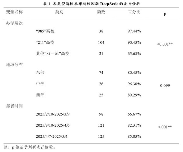 從創新擴散的視角來看,DeepSeek在高校層級與地域層面的推廣過程呈現出典型由上而下的擴散路徑,部署態勢表現出顯著的層級化差異。從辦學層次來看,DeepSeek部署比例隨著高校辦學層次遞減而逐級降低。如表1所示,截至2025年5月,全國“985”高校中已有38所部署DeepSeek,占比高達97.44%,“211”高校部署率為90.43%,而在非“211”高校但仍屬于“雙一流”建設高校中,僅有69.63%的高校完成部署,不同辦學層次的高校在是否部署DeepSeek上有顯著的統計學差異(p<0.001)。這一趨勢表明,辦學層次較高的高校更易獲得人工智能布局的政策與資源支持,部署節奏也更為迅速,展現出較強的先行示范效應。國家重點建設的“985”與“211”高校,通常擁有更充裕的科研經費與更強的技術基礎設施,在校內具備較為完善的信息化管理體系,更容易對接并落地通用大模型。相較之下,部分普通“雙一流”高校在硬件投入、技術團隊建設和跨部門協同方面仍存在短板,使其在部署大模型時面臨更多的現實制約。從高校地域來看,部署率在不同區域間的總體差異并不顯著,但仍呈現出一定的地域分布規律。地域差異的成因既包括地區經濟發展水平、教育信息化建設程度等客觀因素,也受到地方政策引導、教育行政管理方式與高校間協作機制的影響。中部地區有較強的區域協同傳統與高校聯盟體系,使得新技術推廣可以通過以點帶面的模式快速擴展。相較之下,東部地區的部署節奏反而略顯滯后,可能與高校自主性較高有關。從部署時間來看,高校大規模部署DeepSeek的時間集中在二月中旬到四月上旬,呈現出迅速增長到逐漸飽和的規律,“雙一流”高校對DeepSeek的部署時間上存在顯著的統計學差異(p<0.001)。