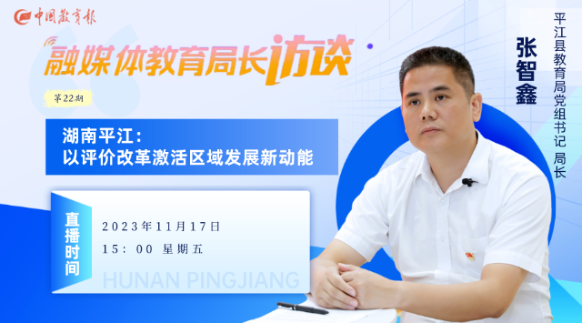 11月17日下午3點,我們有幸邀請到平江縣教育局黨組書記、局長張智鑫做客“中國教育報融媒體教育局長訪談直播間”,與大家分享平江縣近年來在教育評價改革中的探索與思考。