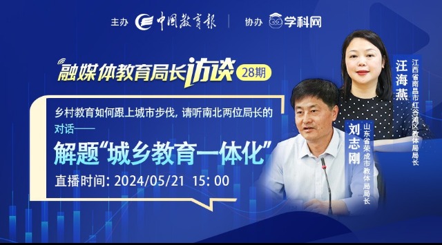 中國(guó)教育新聞網(wǎng)訊(記者 焦小新)今年的政府工作報(bào)告提出,要“加快建設(shè)高質(zhì)量教育體系,推進(jìn)義務(wù)教育優(yōu)質(zhì)均衡發(fā)展和城鄉(xiāng)一體化”。具體到區(qū)域?qū)用妫绾我虻刂埔说赝苿?dòng)教育高質(zhì)量發(fā)展、建設(shè)教育強(qiáng)國(guó)、辦好人民滿意的教育?本期,《中國(guó)教育報(bào)》融媒體教育局長(zhǎng)訪談欄目邀請(qǐng)到山東省榮成市教育和體育局局長(zhǎng)劉志剛先生和江西省南昌市紅谷灘區(qū)教體局局長(zhǎng)汪海燕女士做客直播間。兩位局長(zhǎng)將開(kāi)啟一場(chǎng)跨越南北的教育對(duì)話,敬請(qǐng)關(guān)注!