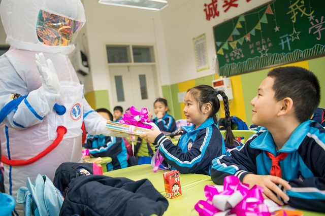 近日,新疆維吾爾自治區烏魯木齊市第五十九小學會展校區教師變身“航天員”為學生們發新書。該校通過組織科技探索、趣味游戲等活動,讓學生們享受校園快樂時光。孫振嵩 攝