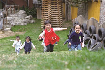 沿著“游戲一條街”往前,再左轉(zhuǎn),一棵高聳的銀杏樹下,是一片紅沙地操場,孩子們或三五成群踢足球,或聚在一起玩泥巴,玩得不亦樂乎。對(duì)面是游戲區(qū),山坡、樹屋、木橋、流水……掩映在花木之間,宛如童話世界。孩子們歡聲笑語,就像穿梭其中的小精靈。