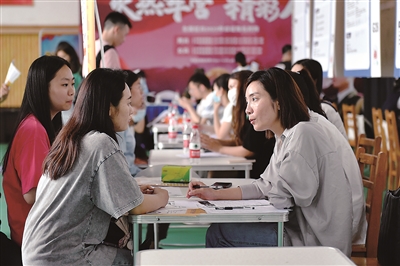 5月19日,在中南林業(yè)科技大學(xué)涉外學(xué)院,應(yīng)屆畢業(yè)生與招聘人員(右)交流。當(dāng)日,湖南省長沙市望城區(qū)2023屆高校畢業(yè)生就業(yè)服務(wù)季啟動式暨中南林業(yè)科技大學(xué)涉外學(xué)院專場招聘會舉行。涵蓋智能終端、新材料先進(jìn)制造、食品醫(yī)藥、移動互聯(lián)網(wǎng)等領(lǐng)域的171家企業(yè),為畢業(yè)生提供5000多個崗位。