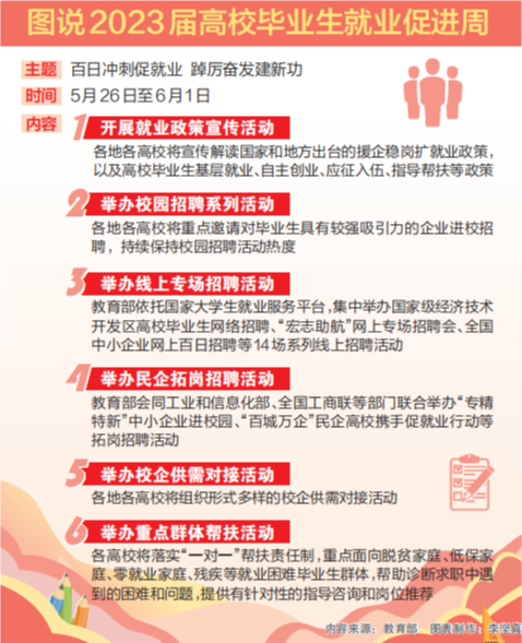 5月26日上午,2023屆高校畢業(yè)生就業(yè)“百日沖刺”行動(dòng)暨就業(yè)促進(jìn)周啟動(dòng)儀式在京舉行,部署各地各高校加力加快促進(jìn)高校畢業(yè)生就業(yè)。
