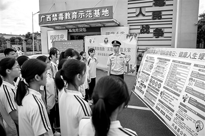 6月19日,在廣西禁毒教育示范基地,民警在做禁毒宣傳。在第36個國際禁毒日來臨前,廣西興業縣禁毒整治辦聯合教育局、公安局在位于該縣城區的廣西禁毒教育示范基地對學校師生開展禁毒宣傳活動,增強廣大師生們的識毒、防毒、拒毒意識。
