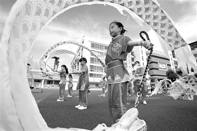 6月25日,在福建省福州市倉山區(qū)教師進修學校附屬第一小學,學生們正在進行新型彩帶龍展示。近年來,該校積極創(chuàng)新陽光體育大課間活動內容,將傳統(tǒng)體育項目列為校本課程,聘請了非遺傳承人組建舞龍、舞獅社團,進行基礎專業(yè)技藝訓練,讓學生在豐富多彩的文體活動中鍛煉身體、共享陽光、快樂成長。謝貴明 攝