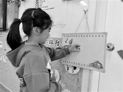 活動(dòng)過程:我們把毛氈布固定在鐵皮墻上,幼兒可以自主選擇日期,用喜愛的方式表示“星期幾”,再將號(hào)碼畫在磁鐵帽上,讓其成為代表自己的個(gè)性磁鐵。磁鐵下方放置值日生安排表,若磁鐵擺放混亂,可以根據(jù)安排表調(diào)整位置,在此過程中,幼兒的比較、推理能力得到了鍛煉?!爸等諌Α钡牧硪粋?cè),展示幼兒繪制的值日內(nèi)容圖和工作牌。