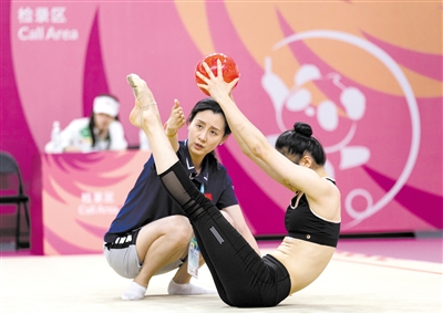 7月25日,成都大運會中國大學生藝術體操隊集體項目主教練任爽(左)在成都體育學院體操館指導隊員訓練。新華社記者 江宏景 攝