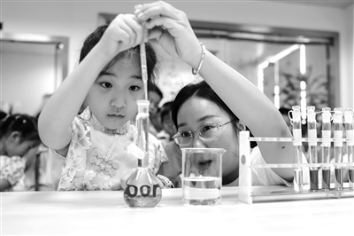 8月11日,浙江省湖州市長興縣食品藥品檢驗檢測中心實驗室,小朋友在工作人員指導下進行定容科普實驗。暑假期間,浙江省湖州市長興縣食品藥品檢驗檢測中心開展科普研學活動,學生們在實驗室內參與手指測菌、會呼吸的酵母菌、蔬菜水果農殘快檢等沉浸式趣味科普小實驗,以“玩”促“學”,寓教于樂,學習食品安全知識。
