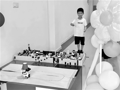 我們還投放了數智化建構材料,孵化出多種探究未來的學習方式。比如,機器人材料,幼兒可以自主設計游戲規則,探究機器人行進路線。如在設計“叢林探險”游戲時,幼兒有許多新奇的想法:需要讓機器人穿越多條路線;得有起點和終點……在創設路徑時,幼兒用旗幟卡作為起點,用獎杯卡作為終點,通過機器人識別系統,成功解決了問題。