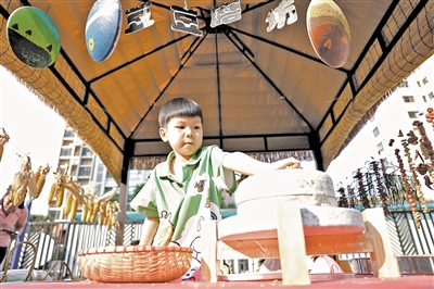 近日,天津市津南二幼金芳園的孩子在體驗(yàn)?zāi)ザ棺印T?0月16日世界糧食日來(lái)臨之際,該園充分利用園所內(nèi)種植的糧食作物,在幼兒中開(kāi)展糧食“變身”體驗(yàn)活動(dòng),幫助孩子養(yǎng)成珍惜糧食的良好習(xí)慣。本報(bào)記者 陳欣然 攝