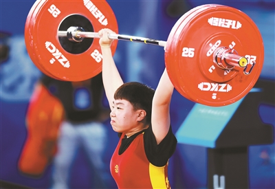 十一月七日,學青會(公開組)舉重項目女子五十九公斤級決賽在南寧舉行,福建廈門市隊楊柳月以總成績二百二十九公斤獲得冠軍。圖為楊柳月在挺舉比賽中。本報記者 張學軍 攝