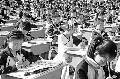 書法教育協作體牽頭學校東風52小學千人書法等級測評現場。茅箭區教育局 供圖