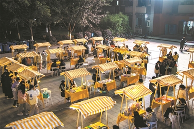 近日,重慶商務職業學院的學生們在夜市購物。今年10月以來,該校開展市集活動,開辟64個攤位,讓在校生成為攤主,經營項目包括校園文創、手工制品等,以此全方位提高學生“雙創”技能。孫凱芳 攝