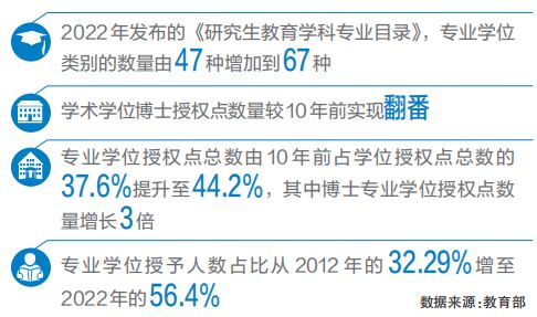 學科專業設置體現了學術學位與專業學位的“并重”。2022年,教育部發布的《研究生教育學科專業目錄》,進一步豐富了專業學位類別,專業學位類別的數量由原來的47種增加到67種,更充分、更精準地對接經濟社會需求,支撐行業產業高質量發展。