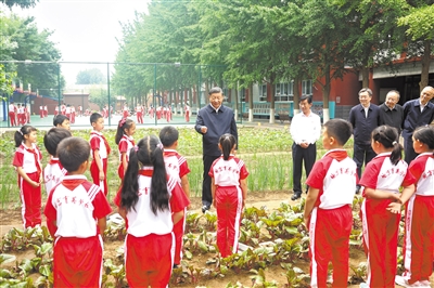 圖② 5月31日上午,中共中央總書記、國家主席、中央軍委主席習近平來到北京育英學校看望慰問師生,向全國廣大少年兒童祝賀“六一”國際兒童節快樂。這是習近平在學生農場同正在進行農業種植實踐的小學生們親切交流。新華社記者 鞠鵬 攝