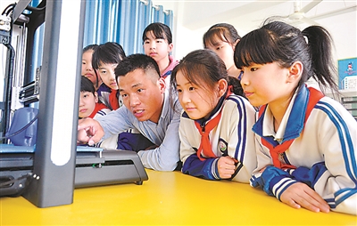 圖⑧ 4月19日,河北省元氏縣宋曹中心小學創新創客興趣小組四年級學生在學習3D打印。成和平 攝