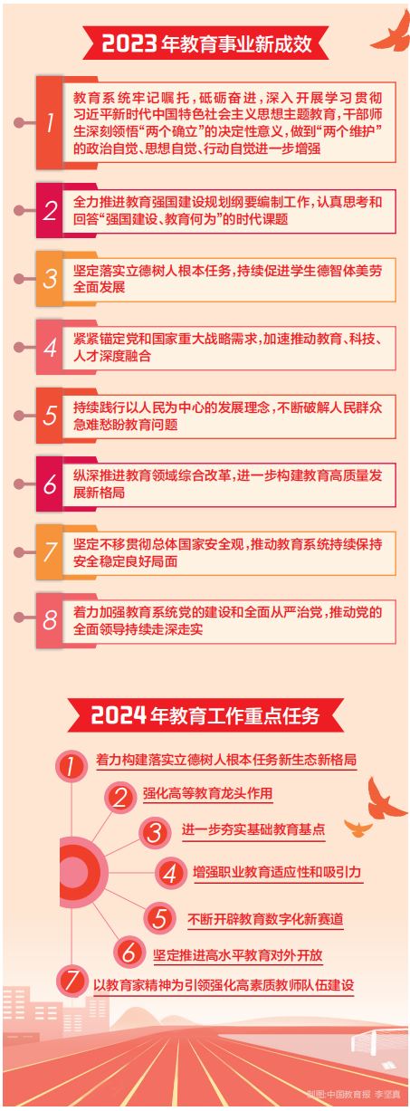 會議指出,剛剛過去的2023年,是全面貫徹黨的二十大精神的開局之年,是實施“十四五”規劃承上啟下的關鍵一年,也是三年新冠疫情防控轉段后經濟恢復發展的一年。一年來,在習近平總書記親自關心、親自部署、親自推動下,教育系統牢記囑托,砥礪奮進,深入開展學習貫徹習近平新時代中國特色社會主義思想主題教育,干部師生深刻領悟“兩個確立”的決定性意義,做到“兩個維護”的政治自覺、思想自覺、行動自覺進一步增強;全力推進教育強國建設規劃綱要編制工作,認真思考和回答“強國建設、教育何為”的時代課題;堅定落實立德樹人根本任務,持續促進學生德智體美勞全面發展;緊緊錨定黨和國家重大戰略需求,加速推動教育、科技、人才深度融合;持續踐行以人民為中心的發展理念,不斷破解人民群眾急難愁盼教育問題;縱深推進教育領域綜合改革,進一步構建教育高質量發展新格局;堅定不移貫徹總體國家安全觀,推動教育系統持續保持安全穩定良好局面;著力加強教育系統黨的建設和全面從嚴治黨,推動黨的全面領導持續走深走實。一年來,教育系統始終堅持從政治上看教育、從民生上抓教育、從規律上辦教育,推動教育事業取得新突破,教育高質量發展打開新局面,為黨和國家工作大局作出了新的貢獻。