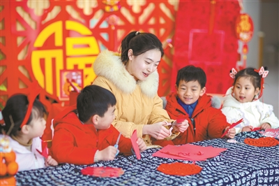 1月22日,在江蘇省興化市昭陽湖幼兒園,教師指導(dǎo)小朋友剪窗花。寒假臨近,該幼兒園開展豐富多彩的活動,孩子們在教師的指導(dǎo)下寫“福”字、剪窗花,體驗(yàn)民俗,喜迎新春佳節(jié)。周社根 攝