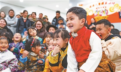 2月3日,孩子們在拉薩的兒童藏裝派對上觀看手偶表演。老師在派對上向孩子們講解藏歷新年的傳統習俗,活動豐富了孩子們的寒假生活。