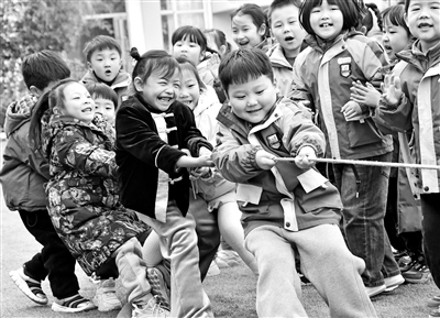 2月26日,河北省邯鄲市永年區洺州幼兒園的孩子們正在進行拔河比賽。胡高雷 攝