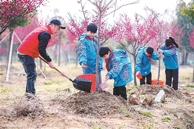 3月12日,浙江省湖州市長興縣夾浦鎮(zhèn)中心小學(xué)學(xué)生和志愿者一起植樹。在第46個植樹節(jié)來臨之際,夾浦鎮(zhèn)開展“大手牽小手 植樹造綠蔭”活動,組織該鎮(zhèn)中心小學(xué)學(xué)生走進(jìn)濱湖村進(jìn)行勞動實(shí)踐,為大自然增添新綠。譚云俸 攝