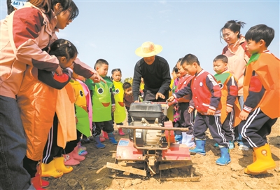 春和景明,正是春耕好時節。日前,在浙江省慈溪市坎墩街道實驗幼兒園的種植園內,孩子們在農民伯伯的幫助下參與勞作,直觀地感受傳統春耕文化,了解農業知識。樊穎杰 攝