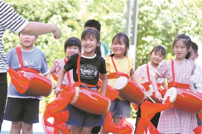 近日,在浙江省德清縣阜溪街道板橋社區工會驛站,參加暑期愛心托班的孩子們在學習打腰鼓。為緩解暑期外地職工子女看護難題,阜溪街道總工會將文化禮堂等文化功能室打造成愛心托管課堂,并組織志愿者開展形式多樣的活動,讓孩子們樂享暑期生活。 謝尚國 攝