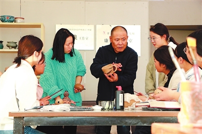 ⑤甘肅省工藝美術大師康存良教學生繪制彩陶。本報記者 尹曉軍 攝