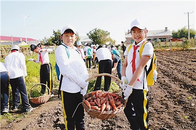 ③哈爾濱市繼紅小學學生走進繼紅致知實驗田采摘紅薯。