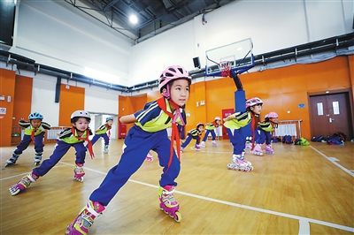 ②長春新區北湖英才學校學生在參加輪滑訓練。