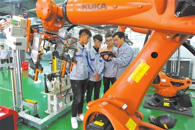 ③長春汽車職業技術大學學生在工業機器人技術中心參加實訓。