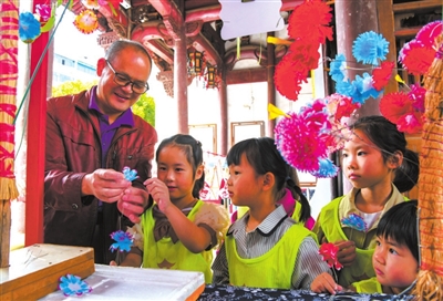 10月4日,在浙江省金華府城隍廟,小朋友觀賞手工藝人制作紙花。時寬兵 攝(新華社發)