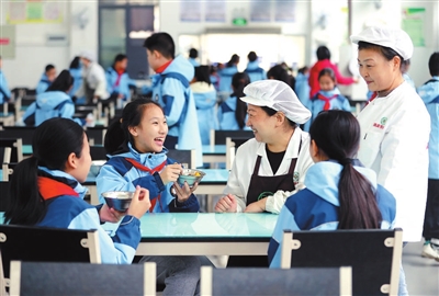 10月21日,在湖北省荊門市掇刀區名泉小學食堂,“家長主廚”在征求學生們對校園餐的意見。該校聘請15名家長為校園“家長主廚”,參與和監督學校食品及原材料定價、采購等相關環節,保障校園餐的安全與營養。 趙平 攝