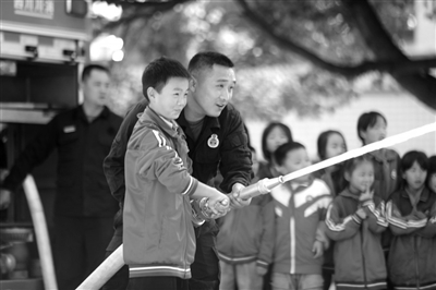 近日,消防員在貴州省黔西市雨朵鎮扯泥小學指導小學生體驗應用消防水槍,增強學生的消防安全意識。