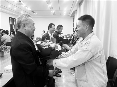 在山東省淄博市高青縣魯才高級(jí)中學(xué)“青藍(lán)工程”結(jié)對(duì)培養(yǎng)儀式上,青年教師為師父獻(xiàn)花。 學(xué)校供圖