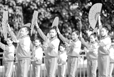 四川省華鎣市占云小學的學生們在展示特色武術“太極功夫扇”。資料圖片