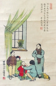 這幅畫正懸掛于中國現代文學館C座的二樓展廳,由豐子愷繪圖,葉圣陶題字。1948年元旦,為吸引更多讀者訂閱《中學生》雜志,出版社刊印了漫畫《新衣》作為贈品夾在書內。畫中的五口之家人人都穿著嶄新的厚棉衣,沉浸在祥和的節日氛圍之中。窗臺上,水仙花開得正艷,孩子們的笑容也異常燦爛。葉圣陶的題詩為:“深知天下猶饑溺,試著新衣色赧然,安得家家俱飽暖,眉梢喜溢過新年?!比婎}字書風清雅,筆畫工整,寄予了對未來的美好夙愿。