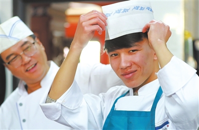 和碩縣高級中學烹飪專業學生艾力·艾山(右)被當地一家知名餐廳錄用,受到餐廳主管的好評。