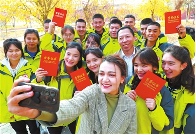 新疆和碩縣高級中學教師熱洋古麗,用手機和在當地烹飪行業技能大賽中斬獲多項榮譽的師生一起記錄獲獎后的幸福時刻。