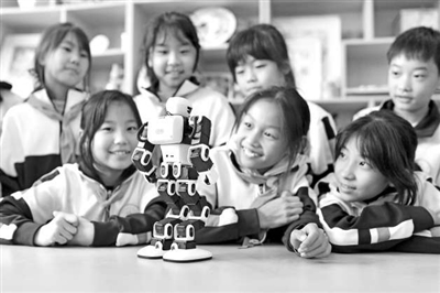 日前,在山東青島洛陽(yáng)路第一小學(xué)設(shè)立的科普課堂上,學(xué)生們?cè)谟^看機(jī)器人表演。 王海濱 攝