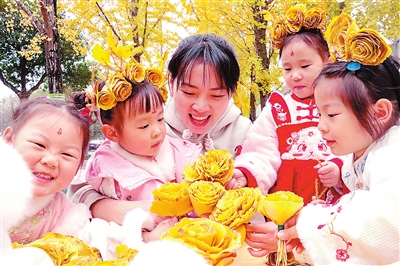 日前,浙江省湖州市長興縣水木花都幼兒園的教師和孩子們一起在銀杏大道上撿拾銀杏葉,設(shè)計(jì)制作出了一朵朵個性十足的銀杏葉簪花?;顒又?,孩子們親近大自然,鍛煉動手能力,發(fā)揮想象力和創(chuàng)造力。圖為教師和孩子們共同欣賞簪花作品。 通訊員 譚云俸 尹鍶 攝