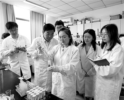 “全國高校黃大年式教師團隊”河海大學水環境模擬與生態修復團隊負責人華祖林教授(左二)指導研究生做實驗。 河海大學供圖